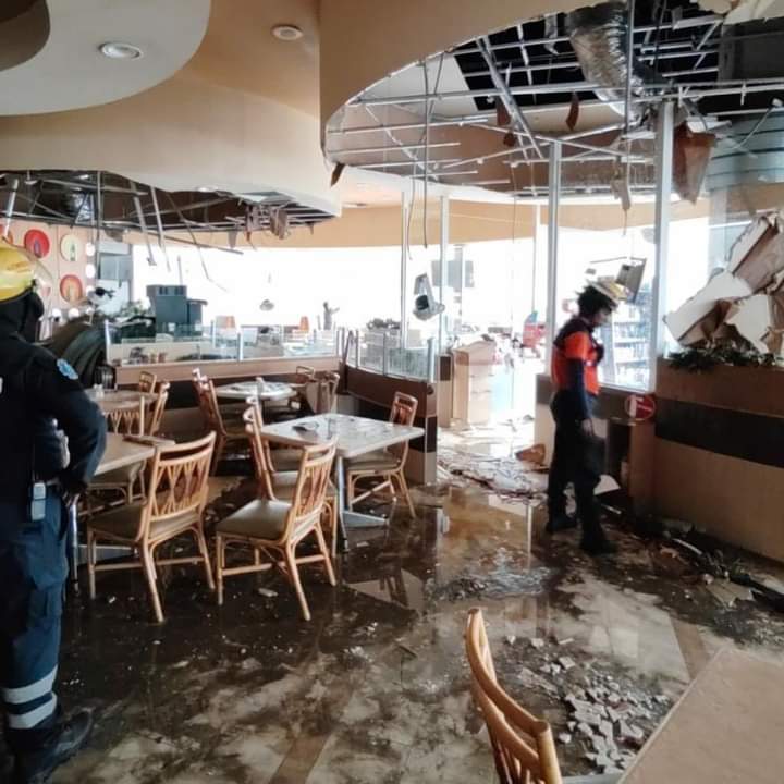 En las imágenes compartidas se aprecia cómo el techo sufrió una filtración y segundos después colapsó, en la zona de las mesas. Por fortuna al momento de la caída del techo no se observa la presencia de comensales por lo que no hubo lesionados.
